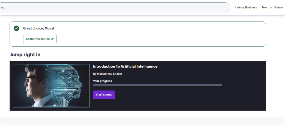 1 – افتح المتصفح وانتقل إلى موقع Udemy في شريط البحث، اكتب اسم الدورة: “Introduction to Artificial Intelligence” واضغط Enter.