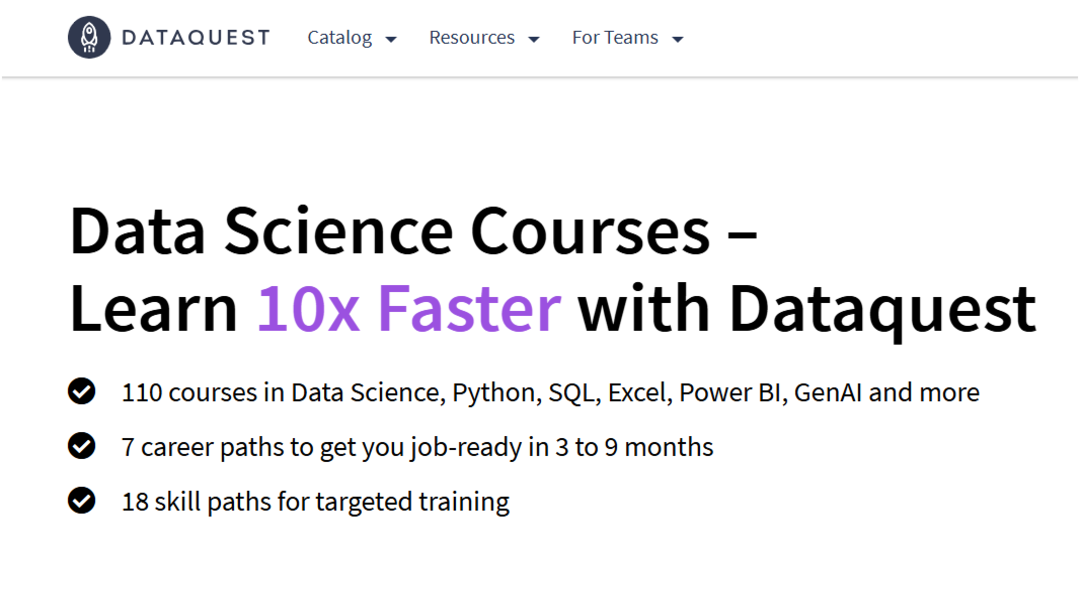 “Dataquest تقدم بعض الدورات التمهيدية مجانًا لتبدأ تعلم علم البيانات، لكن للوصول إلى جميع المسارات والمشاريع العملية والحصول على شهادات معتمدة تحتاج الاشتراك في الخطة المدفوعة.”