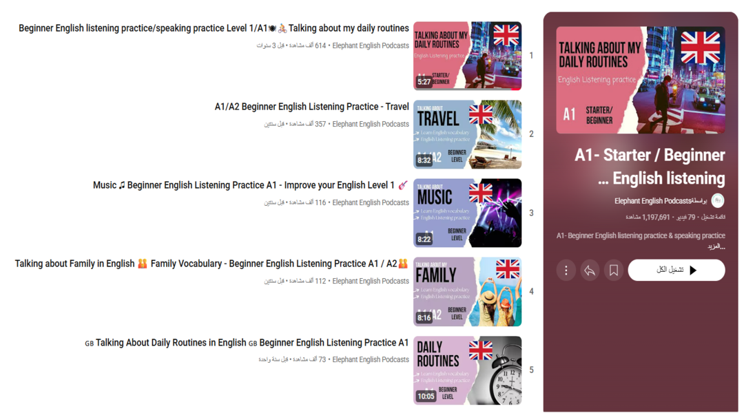 للبدء، قم بزيارة قائمة التشغيل على يوتيوب عبر الرابط: A1- Starter / Beginner English Listening Practice & Speaking Practice وسجل حلقاتك المفضلة لتتابعها بشكل دوري وتلاحظ تقدمك مع الوقت.