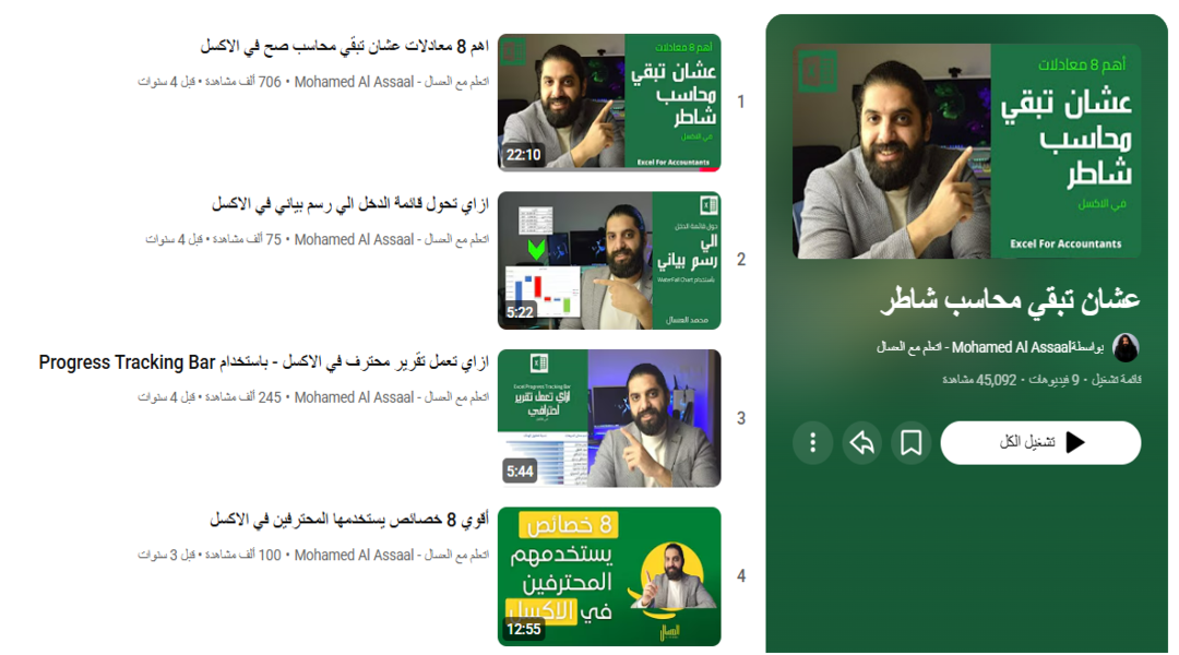 يتم تقديم الكورس على قناة العسال على YouTube بطريقة سلسة ومبسطة. كل حلقة تركز على مهارة محددة، مع أمثلة عملية توضح كيفية تطبيقها. هذه الطريقة تجعل التعلم أكثر تفاعلية وسهولة، خصوصاً للمبتدئين الذين يواجهون صعوبة في التعامل مع المحاسبة وExcel في نفس الوقت.