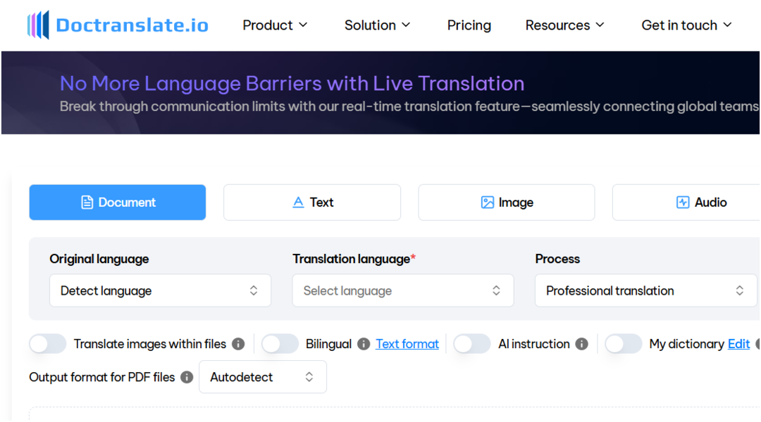 من أبرز مزايا أداة Doctranslate دعمها لعدد كبير من صيغ الملفات مثل DOCX، XLSX، PPTX، PDF، وحتى الصور داخل المستندات. كما يمكنك اختيار لغة الترجمة من بين أكثر من 85 لغة، مع إمكانية تخصيص نغمة الترجمة لتتناسب مع المجال الذي تعمل فيه، سواء كان قانونيًا، طبيًا، أكاديميًا، أو تجاريًا.