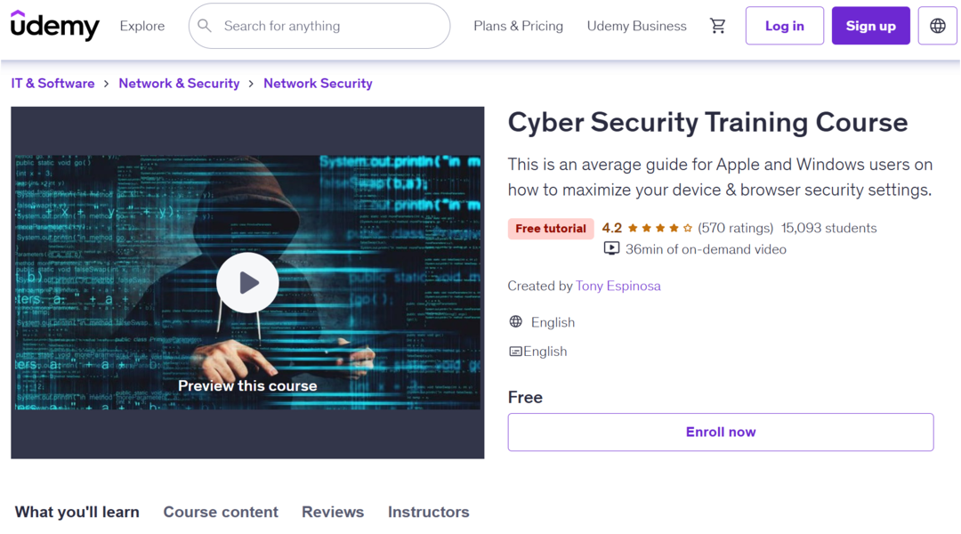 Cyber Security Training Course على Udemy هو كورس مبسط يتناول أساسيات حماية الأجهزة والمتصفحات. مدته حوالى 36 دقيقة، ويُقدَّم بالفيديو عند الطلب، مع إمكانية الوصول “لِمدى الحياة”.
