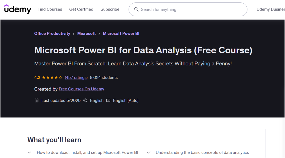تُعد دورة Microsoft Power BI واحدة من أفضل الخيارات المتاحة للمبتدئين الراغبين في دخول مجال تحليل البيانات دون أي تكلفة. تقدم هذه الدورة على منصة Udemy محتوى عمليًا مبسطًا يساعدك على فهم أساسيات تحليل البيانات باستخدام أداة قوية مطلوبة في سوق العمل بشكل متزايد.
